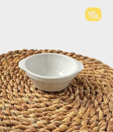 Practical and stylish white ceramic bowl with handles, excellent for serving soups or side dishes at catered functions.
