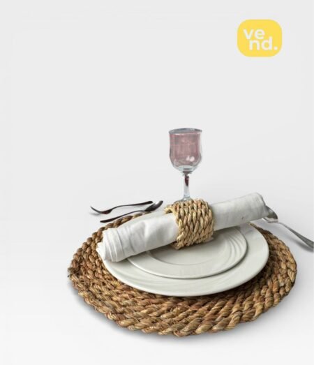 Give your tablescape a beautiful boho touch with this rustic woven tableware set. Ideal for outdoor weddings and parties, available for flexible hourly rental.