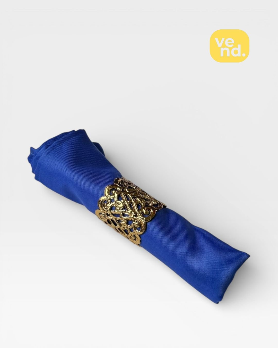 Enhance your luxury table setup with this elegant royal blue napkin, beautifully secured with an ornate gold ring. Available for flexible hourly rental for your events.