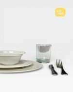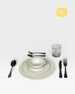 A complete and elegant dinnerware set featuring white plates and sleek black cutlery. Perfect for weddings and formal dinners, ready for flexible hourly rental