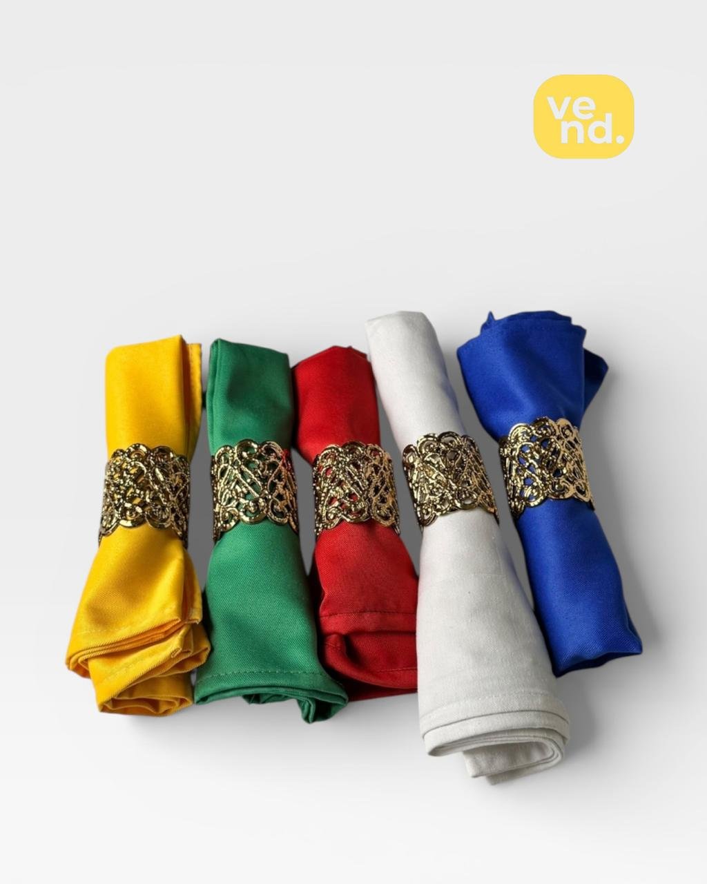 Add vibrant pops of color to your event decor with this premium set of rolled napkins and ornate gold rings. Rent them by the hour to perfectly match your wedding theme.