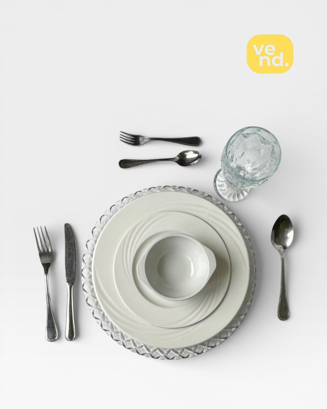 Bring timeless elegance to your table with this stunning crystal-accented dinnerware. Perfect for upscale weddings and banquets, available for convenient hourly rental.
