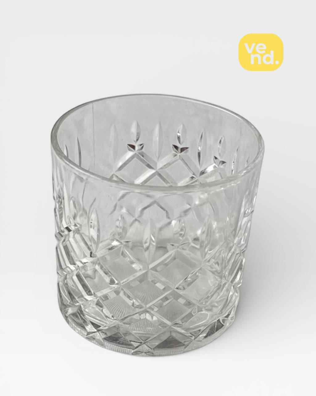 Serve beverages in style at your next party or reception with this classic crystal cut lowball glass. It adds timeless elegance to any occasion and is available for hourly rental.