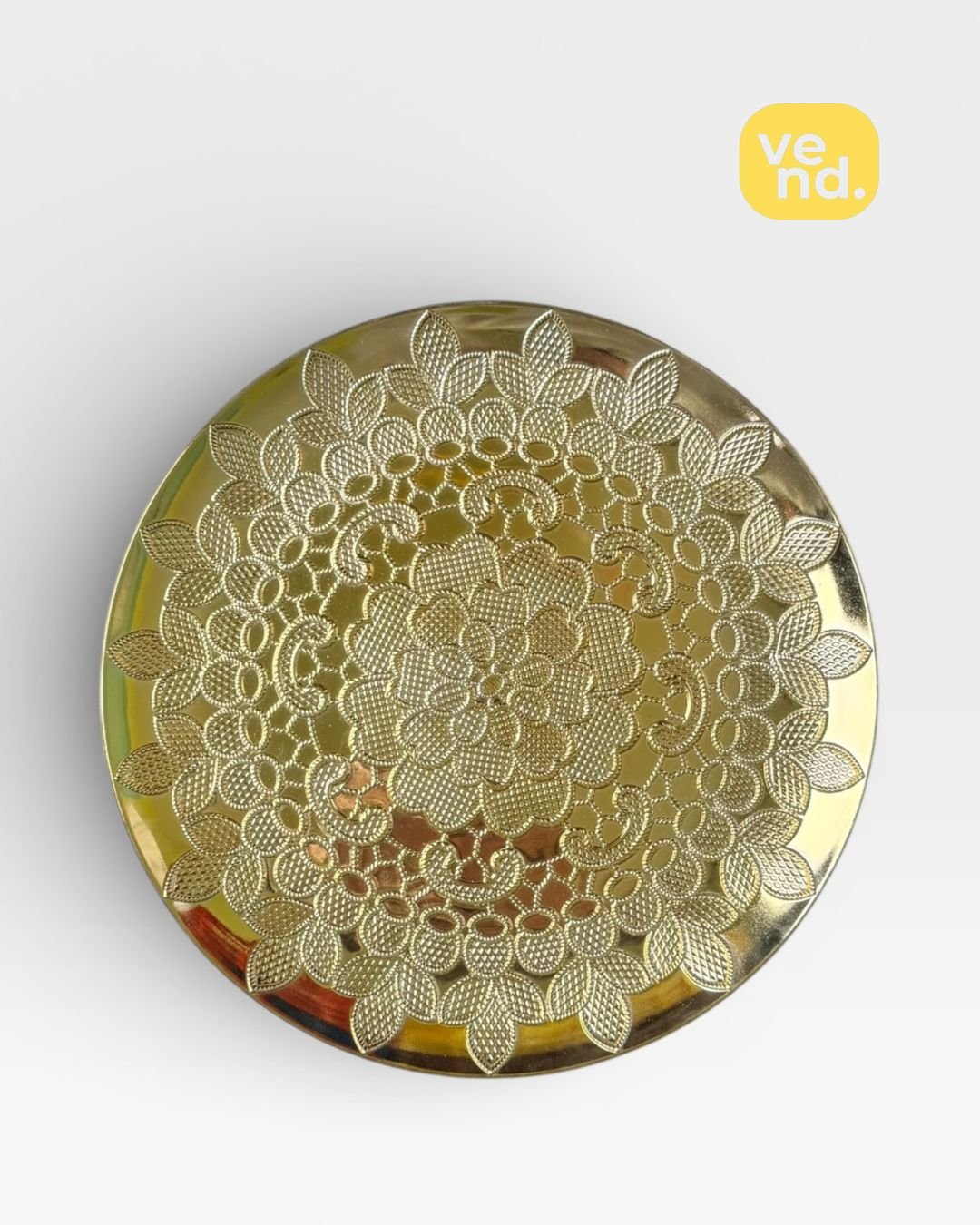 Elevate your event's glamour with this stunning ornate gold plate featuring intricate floral details. Ideal for luxurious wedding setups and available for hourly rental.
